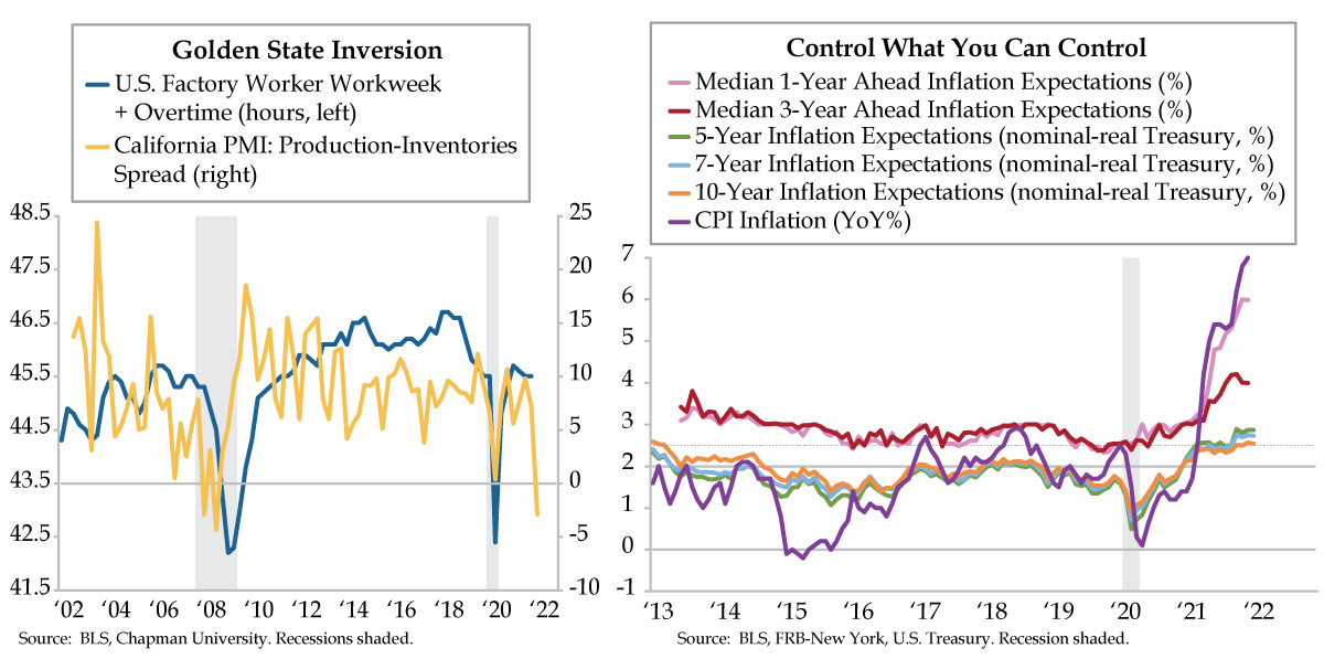 The economy of the largest U.S. state has some sway in this dynamic. The Chapman University California purchasing managers’ index (PMI) revealed an inversion of sorts: demand running below supply. At 62.2, the Production index eased to a two-year low in 2022’s first quarter, while the Inventories index, at 65.1, rose to a record high. The resulting -2.9 Production-Inventories level (yellow line) was only the third time this demand-supply spread dipped into negative territory in the 20-year history of the survey. For posterity, the other two subterranean moments occurred during the 2007-2009 recession.