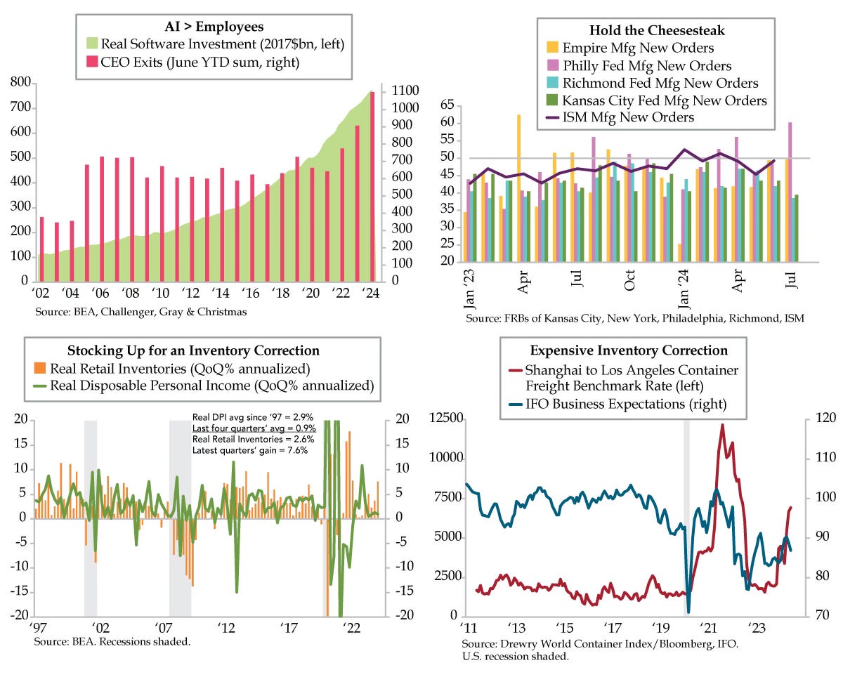Per Andrew Challenger, “Leaders are anticipating a sea change as we enter the second half of this year, perhaps politically, but certainly technologically.” Such understatement! Consider the second-quarter CFO survey, a collaboration of Duke University’s Fuqua School of Business and the Richmond and Atlanta Federal Reserve Banks: “Nearly two-thirds of CFOs say their companies have a strategic priority to automate tasks typically performed by employees.” And here’s the part that resonated given the internals of yesterday’s second-quarter GDP report – nearly 85% of large firms implemented automation in the last 12 months, up from 75% of large firms in the first quarter.